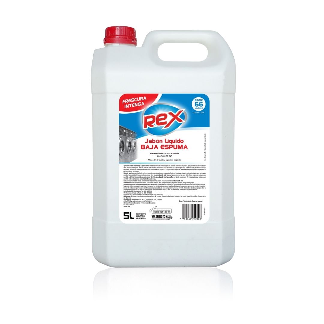 Jabón Líquido Baja Espuma Rex es un detergente líquido formulado para ser usado en lavanderías en general, apto para el lavado de todo tipo de textil, prendas como algodón, algodón/poliéster. Especialmente recomendado para ser utilizado en ropa fina y de color. Puede utilizarse para el lavado manual de prendas. Formula que realza el color blanco, alta concentración de fragancia. La fragancia es sinérgica con Suavizante Rex para lograr una mayor potencia de perfumado en las prendas.